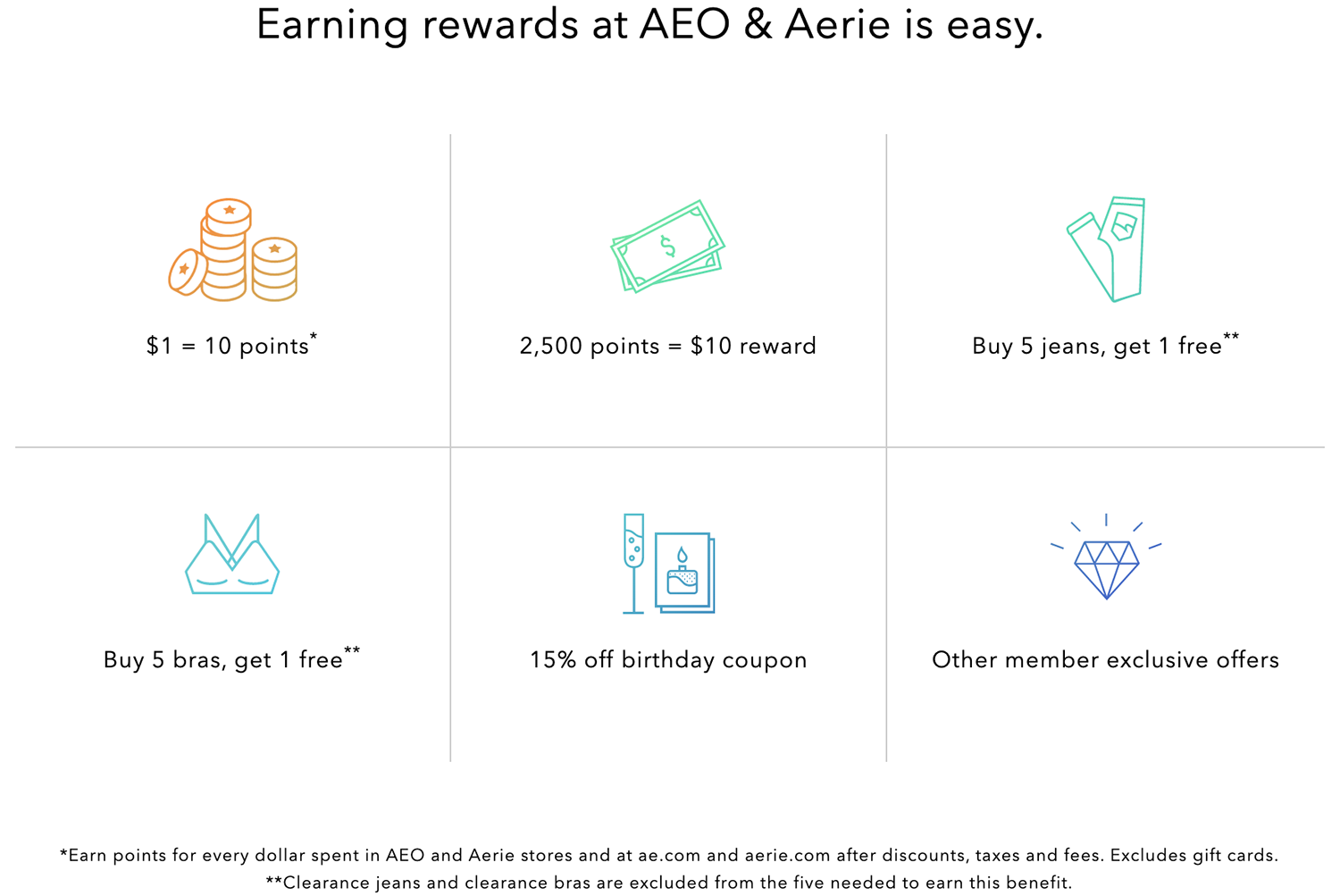 In September 2017, American Eagle Outfitters overhauled their almost decade-old loyalty program that revolved around mailed percent-off coupons based on the customers quartly spending with AEO. The new program, AEO Connected, had 2 tiers in which customers could earn digital dollar rewards, free jeans and free bras at different rates depending on their annual spend. Additional perks were given to AEO credit card holders.